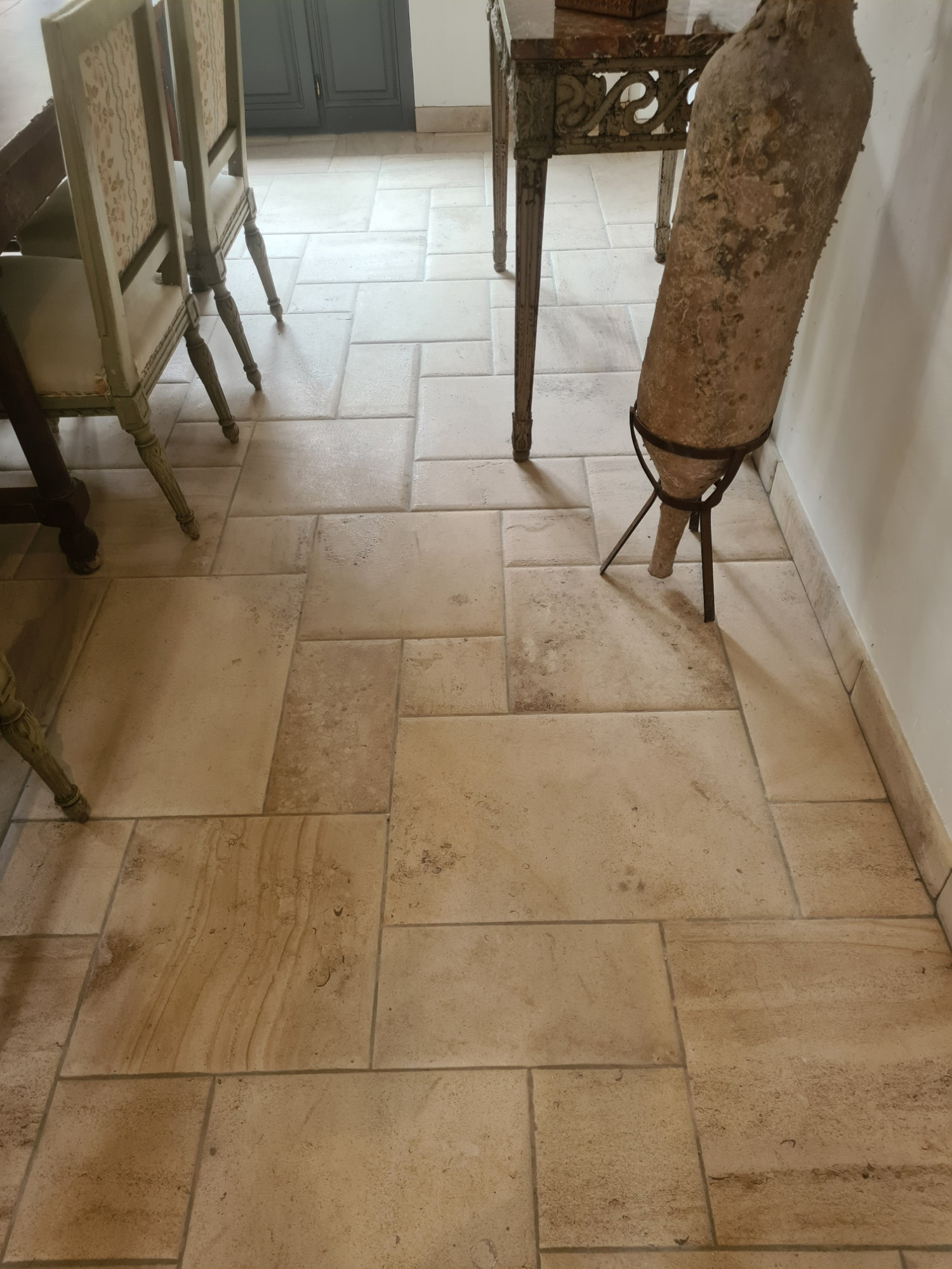 Sols réalisés partir d'opus incertum, chutes de sciage sans forme ni dimension fixe, composé d'un mélange de différentes pierres de Bourgogne. Certains sols ont nécessité la recoupe et l'adaptation des chutes par le poseur pour former un opus romain composé de dalles rectangulaires et non plus de chutes difformes.