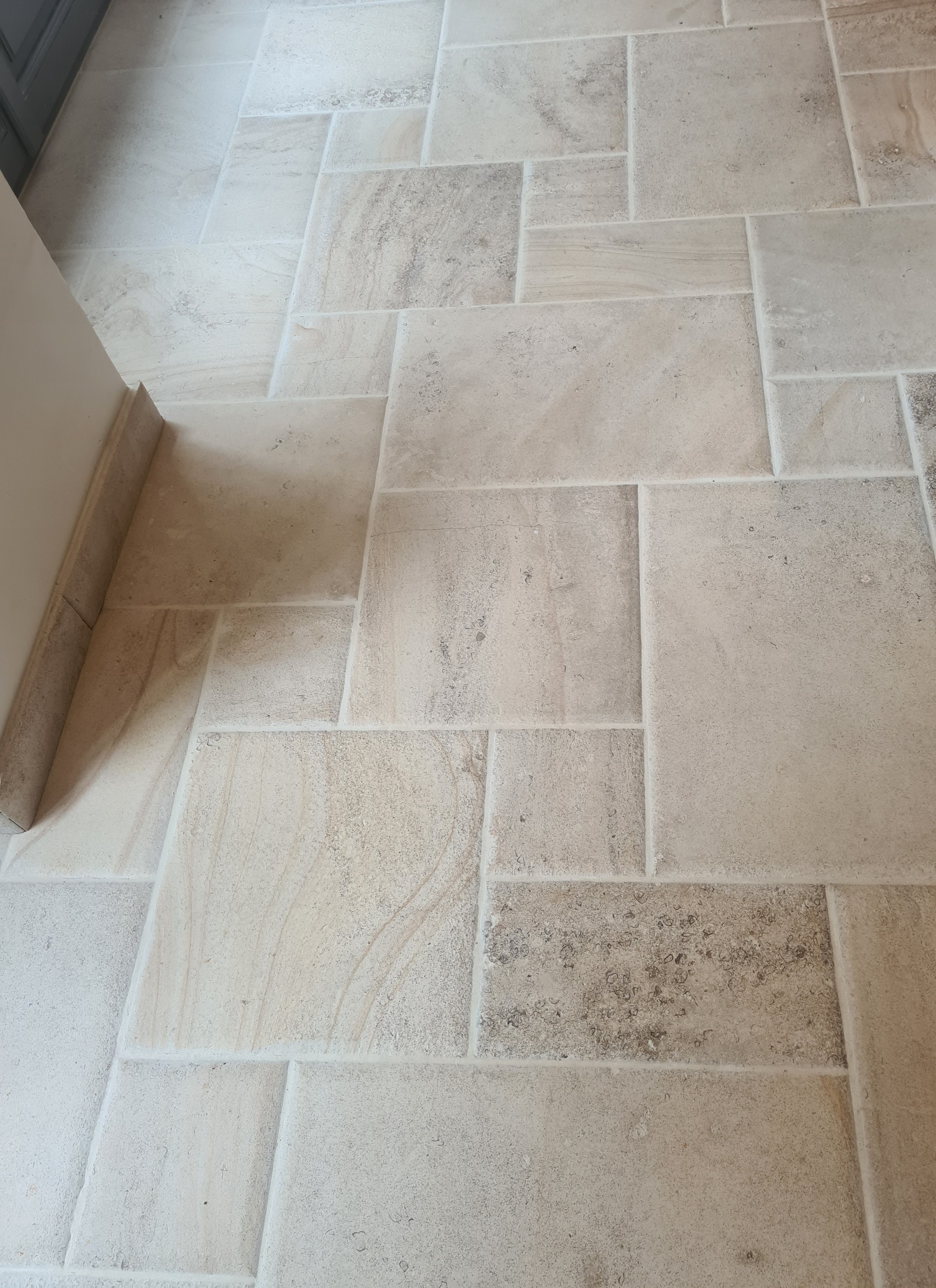 Dallage format opus romain grille Chaumière, pierre de Semond clair B1 rubanée, face adoucie arêtes épaufrées main.